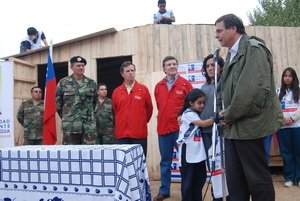 Un importante convenio para la construcción de viviendas de emergencia fue firmado hoy por el Ministro de Educación, Joaquín Lavín; el General de Brigada del Ejército, Antonio Cordero y el fundador de Un Techo para Chile, el capellán Felipe Berríos.