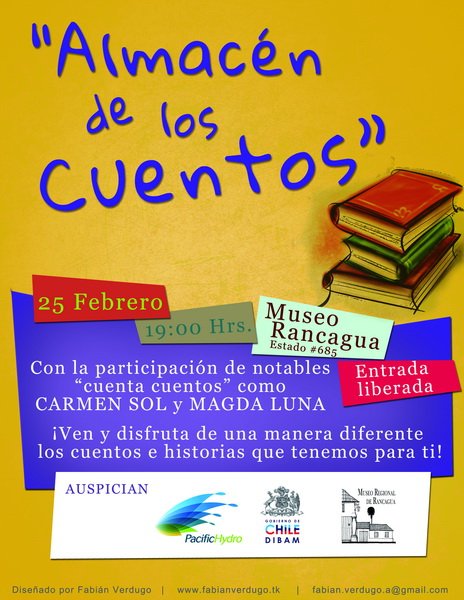 El evento "Alamacén de Cuentos", se realizará en las dependencias del museo regional de Rancagua el día 25 de Febrero a las 19hrs. Este trata de una narración de historias hechas por unas connotadas cuenta cuentos de la región Carmen Luna y Magda Sol.