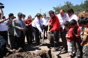 Jueves 3 de febrero de febrero de 2011. El encargado nacional de Aldeas y Campamentos, Juan Covarruvias, junto al Seremi de Vivienda y Urbanismo, Ragnar Branth y el Gobernador de la Provincia de Colchagua, Eduardo Cornejo, asistieron a la colocación de la primera piedra de las villas Bicentenario I, II, III y IV, pertenecientes a la comuna de Santa Cruz.