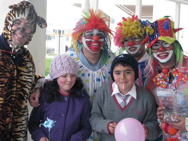 Tres payasos y un tigre se pasearon por los unidades del establecimiento de salud en busca de niños y niñas, a quienes en su paso les regalaron dulces y globos para conmemorar su día, presentes que fueron muy bien recibidos por los menores y por sus respectivos padres.