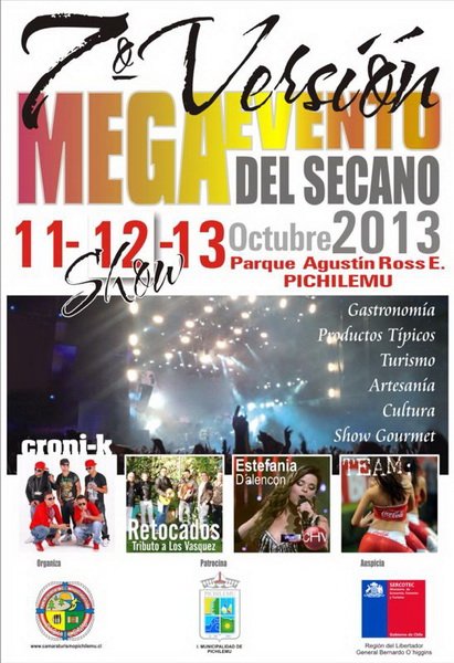 Como ya es costumbre en el Parque Agustín Ross de la comuna de Pichilemu, se realizará la séptima versión del Mega Evento del Secano 2013, evento que contemplará al igual que en años anteriores Feria Cultural, Artesanal y Gastronómica y un gran show artístico masivo para la noche culmine.