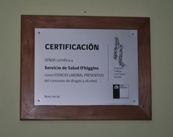 Como Espacio Laboral Preventivo del consumo de drogas y alcohol fue certificado el Servicio de Salud O´Higgins por parte del Servicio Nacional para la Prevención y Rehabilitación del Consumo de Drogas y Alcohol (SENDA) y que declara el compromiso de la institución de llevar a cabo una serie de políticas dirigidas a los funcionarios orientadas hacia la capacitación en talleres que ayudan a tratar esta problemática entre los trabajadores y su entorno familiar.