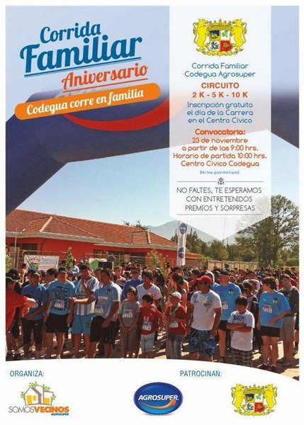 El próximo sábado 23 de noviembre desde las 8:30 de la mañana, en el Barrio cívico de Codegua se realizará la Gran Corrida Familiar Agrosuper 2013, patrocinada por el Municipio de Codegua y organizada en conjunto con la empresa Agrosuper.