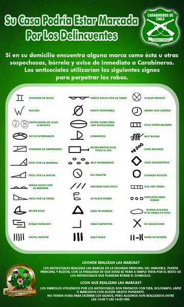 Esto, ya que desde hace algunos años, ciertos antisociales están escribiendo signos en las fachadas principales de los inmuebles, puertas o buzón con la intención de que estas sean visualizadas a simple vista por el resto de los delincuentes que planean robar el domicilio y así facilitar su labor.