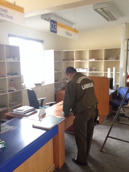 Personal del Laboratorio de Criminalística de Carabineros (Labocar) y de la Sección de Investigación Policial (SIP) de la 2da. Comisaría Graneros se encuentran realizando diligencias para dar con el o los autores del robo perpetrado en la Oficina del Registro Civil de Graneros durante la noche del martes, donde sustrajeron dinero en efectivo.