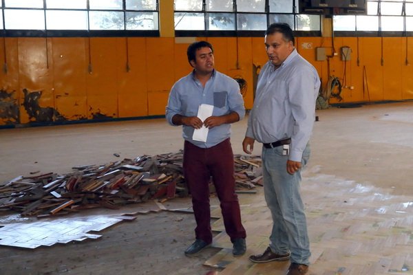 Luis Berwart explicó que “se están renovando unos 70 metros cuadrados de los más de 550 metros cuadrados de parquet con que cuenta la cancha del Gimnasio Municipal, cuyo piso está siendo pulido y vitrificado en su totalidad”.