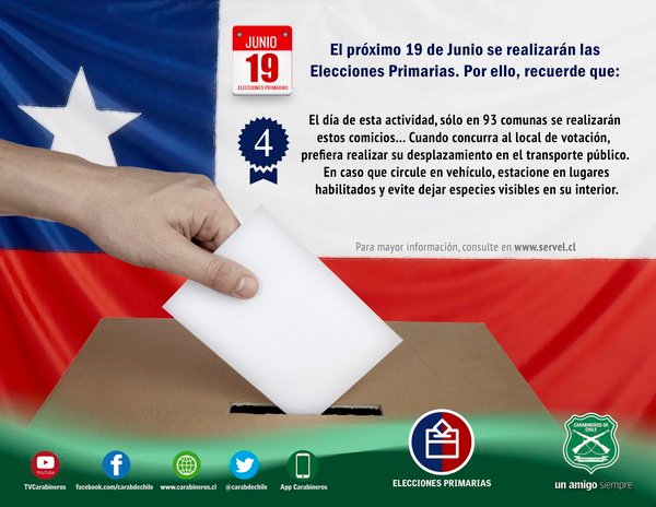 Carabineros dispondrá de servicios preventivos y de fiscalización en las inmediaciones de los locales de votación en las comunas de La Estrella, Litueche, Machalí, Olivar, San Fernando y San Vicente de Tagua Tagua, donde este domingo 19 de junio, se realizarán las Primarias Municipales en la Región, así lo dio a conocer el Jefe de la VI Zona de Carabineros, General Omar Gutiérrez Gámbaro.