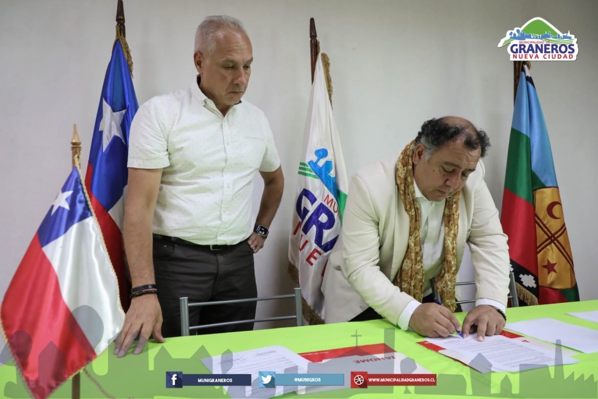 El alcalde de la comuna de Graneros, Claudio Segovia Cofré y el presidente de Janome, para Latinoamérica, Juan Carlos González, firmaron un convenio de colaboración que permitirá que participantes del Programa Mujeres Jefas de Hogar puedan realizar talleres de corte, confección, y diseño de vestuario.
