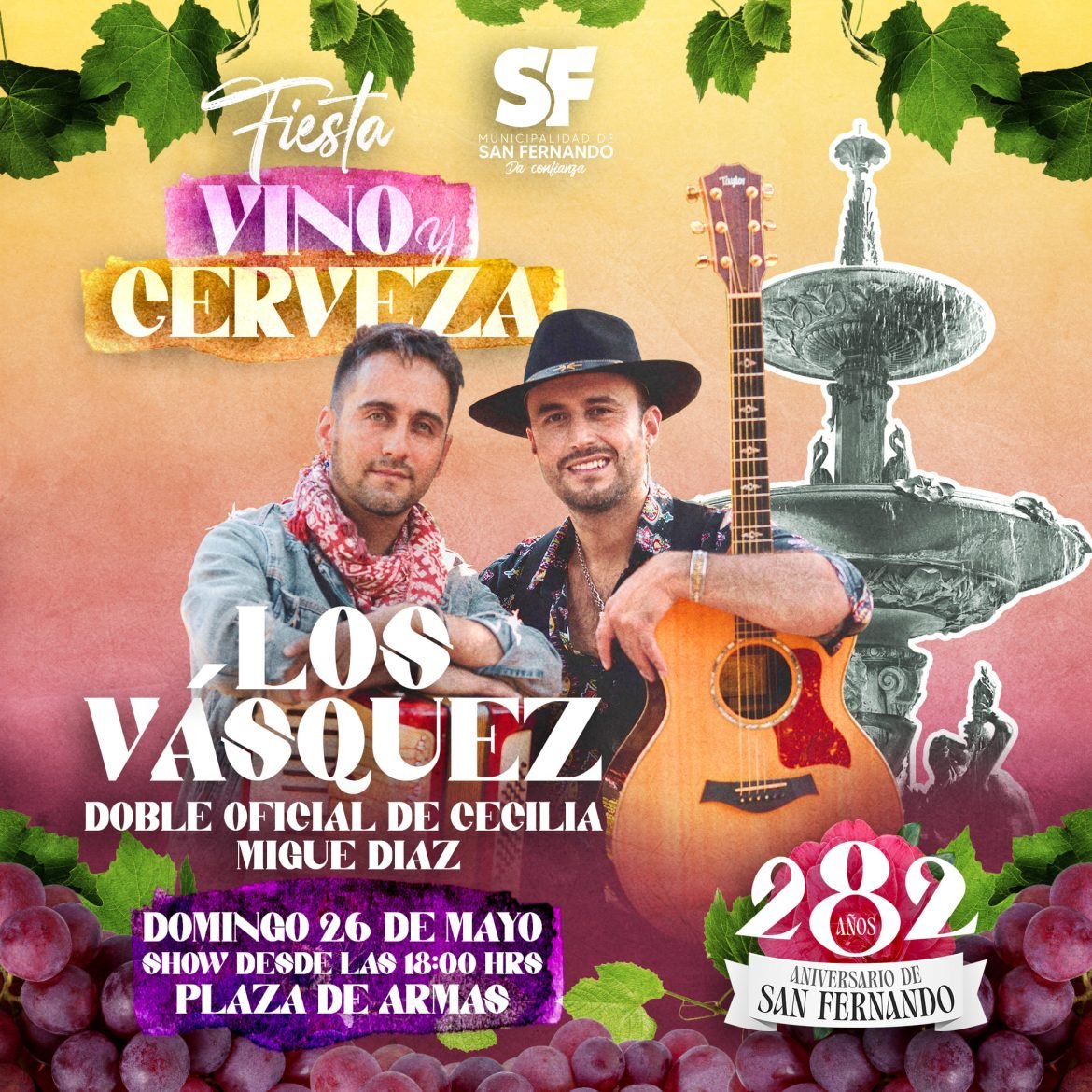 En este marco, destaca en la agenda la “Fiesta del Vino y la Cerveza”, instancia programada entre los días 24 y 26 de mayo, evento donde las familias podrán disfrutar, en la Plaza de Armas de la comuna, de una exposición de productores vitivinícolas y cerveceros de la comuna y sus alrededores, emprendedores gastronómicos y presentaciones de artistas en vivo donde destacan el grupo de merengue puertorriqueño Caña Brava, la agrupación tropical Megapuesta y de Los Vásquez, principales exponentes del “Pop Cebolla” en Chile.