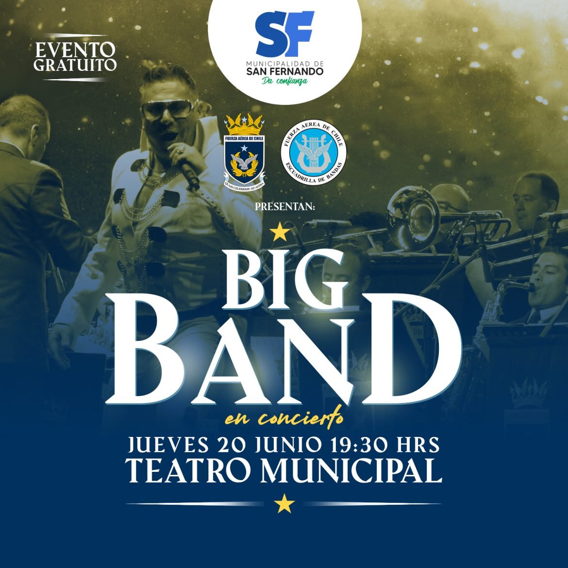Con un variado repertorio, el próximo jueves 20 de junio, la Big Band de la Fuerza Aérea de Chile ofrecerá un concierto gratuito en el Teatro Municipal de San Fernando a las 19:30 horas.