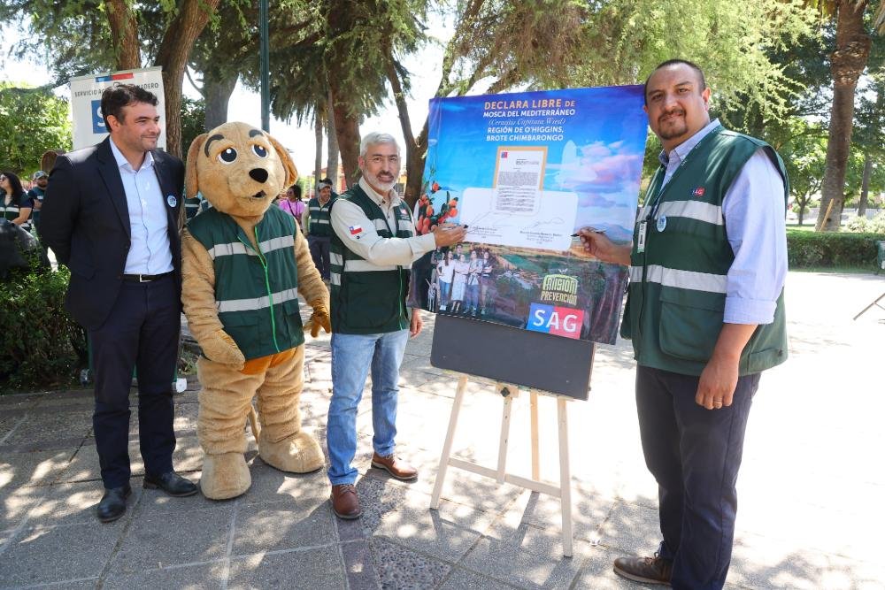 El Director Nacional del Servicio Agrícola y Ganadero, José Guajardo Reyes, presidió el acto mediante el cual se dio cierre formal a la campaña de erradicación de la mosca de la fruta (Ceratitis capitata) en la comuna de Chimbarongo. A la actividad, generada para reconocer a la comunidad por su apoyo, acudieron diferentes representantes de la actividad gremial, liderados por el Gerente de Frutas de Chile, Miguel Canala-Echeverría, autoridades y funcionarios y funcionarias del SAG.