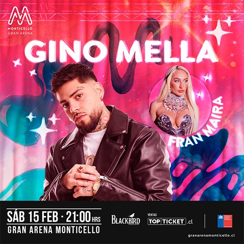 Gino Mella subirá al escenario de San Francisco de Mostazal, para demostrar que en la actualidad es uno de los artistas más destacados de nuestro país, quien cuenta con el importante de logro de agotar tres conciertos en el recinto de espectáculos del Parque O´Higgins en noviembre del 2023, todo un logro considerando que tiene sólo 23 años y ha forjado su carrera musical a pulso y sin grandes presupuestos.