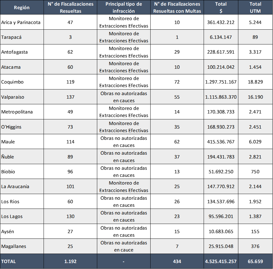 Los cuatro tipos de infracciones al Código de Aguasmás multadas a nivel nacional fueron el incumplimiento al Sistema de Monitoreo de Extracciones Efectivas (38%), mediante el cual el titular de un derecho de aprovechamiento de aguas tiene el deber de registrar la obra de captación de agua, instalar un sistema de medición y transmisión e informar la extracción de caudales a la DGA; ejecución de obras no autorizadas en cauces (37%); extracción no autorizada de aguas (15%) y extracción de áridos no autorizadas en cauces (4%).
