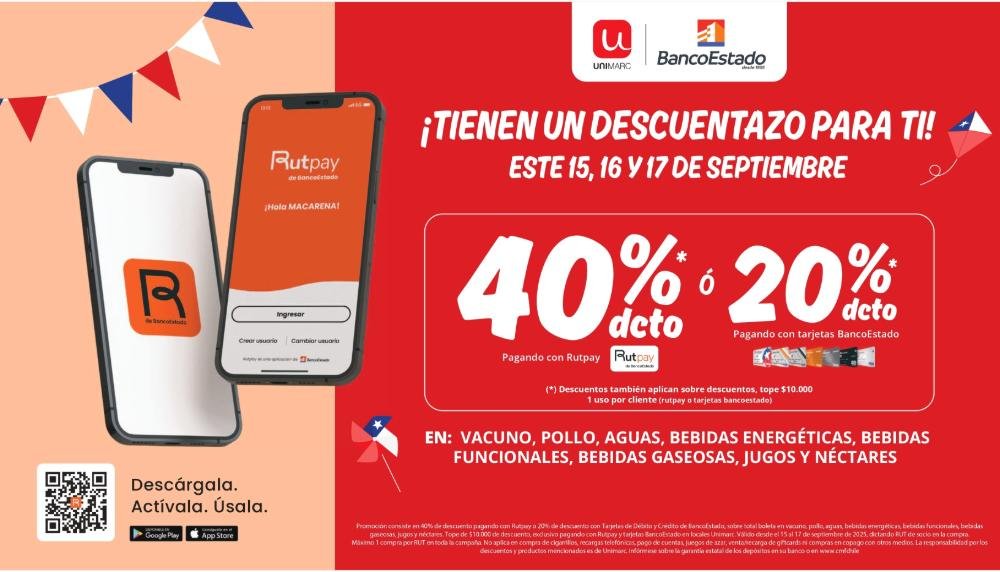 Unimarc y BancoEstado anunciaron una nueva campaña conjunta que permitirá a los clientes obtener importantes beneficios en sus compras para Fiestas Patrias. Durante los días 15, 16 y 17 de septiembre, quienes paguen presencialmente con Rutpay obtendrán un 40% en sus compras, mientras que las personas que utilicen tarjetas de crédito y débito de BancoEstado recibirán un 20% de descuento.