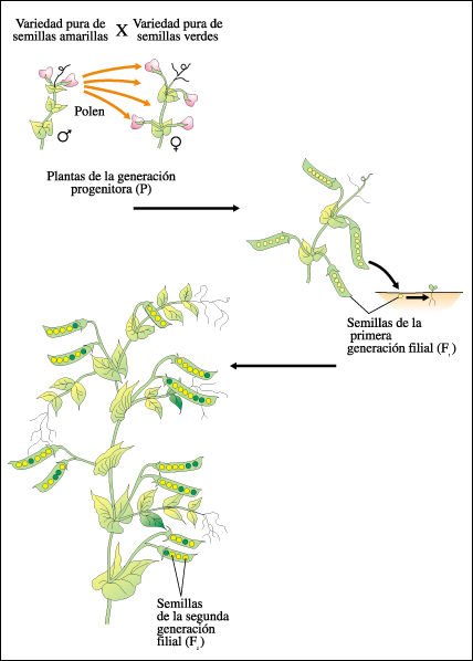 Mendel cruzó una planta de guisante pura de semillas amarillas con una planta pura de semillas verdes, transfiriendo el polen de las anteras de las flores de una planta a los estigmas de las flores de otra planta. Estas plantas constituyeron la generación progenitora (P). Las flores así polinizadas originaron vainas de guisantes que contenían solamente semillas amarillas. Estos guisantes -que son semillas- constituyeron la generación F1. Cuando las plantas de la F1 florecieron, las dejó autopolinizarse. Las vainas que se originaron de las flores autopolinizadas (generación F2) contenían tanto semillas amarillas como verdes, en una relación aproximada de 3:1, o sea aproximadamente 3/4 eran amarillas y 1/4 verdes.