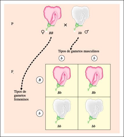 para flores púrpuras, se representa como BB en símbolos genéticos