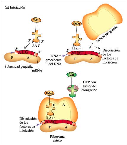 grande se ubica en su lugar, el complejo tRNA-fMet ocupa el sitio P (peptídico).