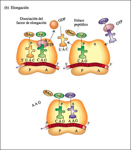se coloca en el sitio A y se forma otro enlace peptídico. La cadena peptídica