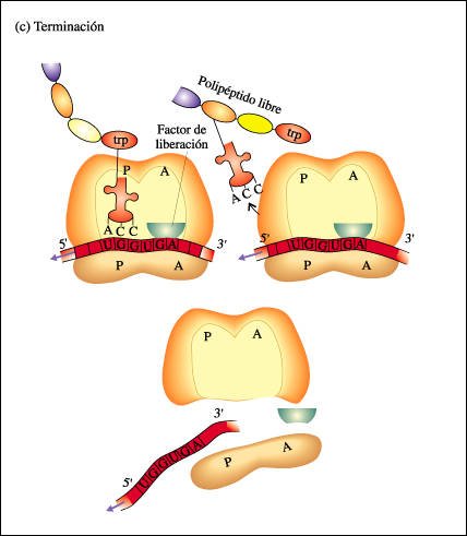 Cuando el ribosoma alcanza un codón de terminación (en este ejemplo UGA), el polipéptido se escinde del último tRNA y el tRNA se desprende del sitio P. El sitio A es ocupado por un factor de liberación que produce la disociación de las dos subunidades del ribosoma.