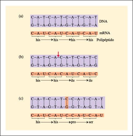 La deleción o la adición de nucleótidos dentro de un gen lleva a cambios en la proteína producida. La molécula de DNA original, el mRNA transcripto a partir de ella y el polipéptido resultante se muestran en a). En b) vemos el efecto de la deleción de un par de nucleótidos (T-A), en donde indica la flecha. El marco de lectura del gen se altera y aparece una secuencia diferente de aminoácidos en el polipéptido. En c), la adición de un par de nucleótidos (C-G en rosa) da como resultado un cambio semejante.