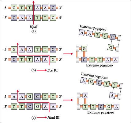 Algunas enzimas de restricción producen cortes de la molécula de DNA que dejan extremos rectos. Otras cortan de manera escalonada, dejando extremos "pegajosos" que luego pueden unirse, por apareamiento de bases complementarias, con otros fragmentos producidos por la misma enzima. Esto hace posible combinar segmentos de DNA de fuentes diferentes.. Una misma molécula de DNA producirá distintos fragmentos, llamados fragmentos de restricción, si es tratada o digerida con diferentes enzimas de restricción. El gran número de enzimas de restricción y de secuencias de reconocimiento diferentes hace posible que se las utilice para empalmar segmentos de DNA genómico de una variedad ilimitada de fuentes.