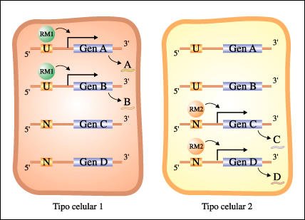 En el ejemplo de la figura siguiente, el tipo celular 1 está caracterizado por la presencia de los productos de los genes A y B. El tipo celular 2 está caracterizado por la presencia de los productos de los genes C y D. Ambos tipos celulares contienen copias de todos los genes. El Regulador Maestro 1 (RM1) se une a los sitios "U" y activa los genes que contienen ese sitio en su región promotora. El Regulador Maestro 2 (RM2) se une a los sitios "N". Las células de tipo 1 contienen el regulador RM1 (una proteína). Por lo tanto, todos los genes con sitios promotores "U" son activados. Como carecen de la proteína reguladora RM2, los genes con regiones promotoras con sitios "N" no son activados. Para el tipo celular 2 se produce la situación inversa.