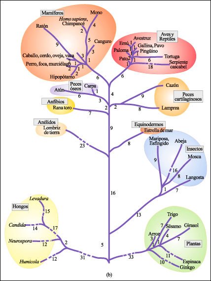 Las principales ramas del árbol filogenético basadas en las comparaciones de las secuencias de aminoácidos de las moléculas de citocromo c.