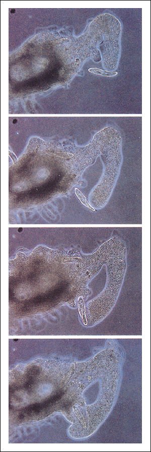 hacia el Paramecium. Un gran seudópodo rodea al Paramecium, lo engloba