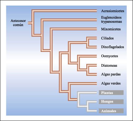 Posibles relaciones filogenéticas simplificadas entre los principales grupos de protistas.