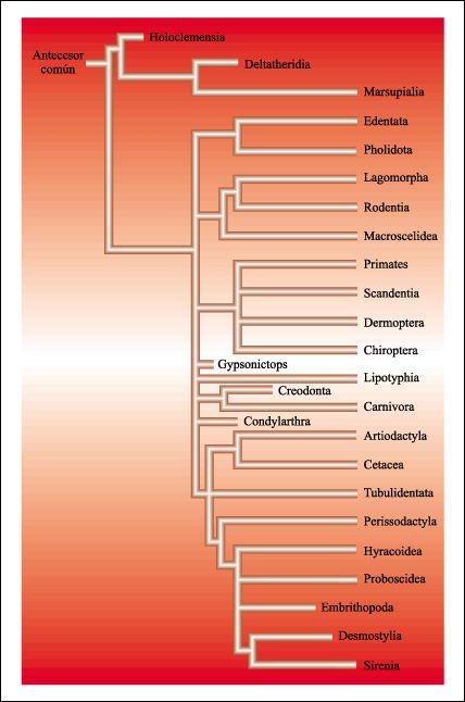 En esta figura se muestran las relaciones tentativas de diversos grupos de mamíferos.