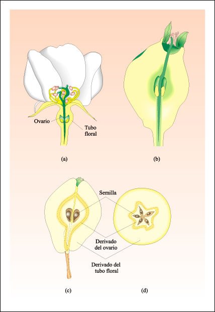 a) Flor del peral. El ovario es la porción basal del carpelo. b) Flor